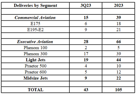 巴航工业2023年第三季度交付量增长30% 共交付43架飞机