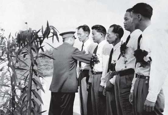 唐凯副局长为参加“北京”号命名仪式的空勤人员挂大红花,右起:机长潘国定、副驾驶闵传霖、报务员卞模然、机械员谢国盛和许道全