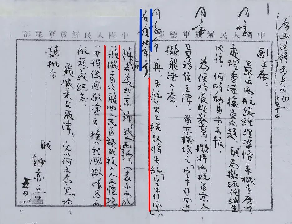军委民航局局长钟赤兵向周恩来总理请示把康维尔240(即空中行宫)命名为“北京”或“人民”号的请示(红线),周恩来总理批示同意为“北京”号(蓝线)