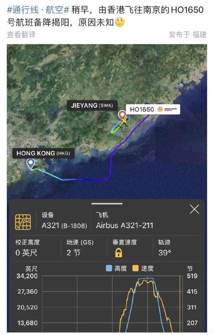 11月8日,吉祥航空从香港飞往南京的HO1650航班备降揭阳机场。据吉祥航空消息,8日中午,HO1650航班(香港-南京)因公共安全原因决策备降,该航班于13:05在揭阳机场安全降落。该航班已按相关程序完成处置流程并即将起飞飞往目的地南京。19时22分左右,吉祥航空表示,后续航班已于19:13起飞。