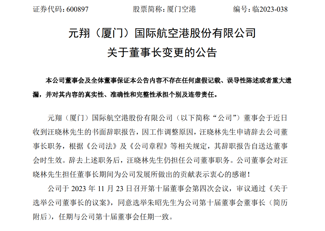 厦门空港董事长汪晓林辞职