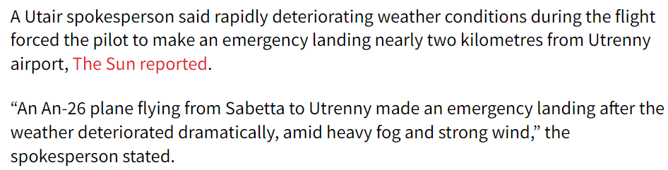 据Interfax报道,涉事客机从北极海沿岸的雅玛尔半岛上的萨贝塔港(Sabetta),飞往乌特连尼(Utrenny)机场,行程快结束时遭遇恶劣天气,在距离机场1.6公里处紧急降落。Utair航空新闻处随后发布消息称,该机是一架包机,机上共有36名乘客和5名机组人员。据《太阳报》报道,Utair发言人表示,飞行过程中天气状况急剧恶化,迫使飞行员在距乌特连尼机场约两公里处紧急降落。“因天气急剧恶化,一架从萨贝塔飞往乌特连尼的An-26飞机在大雾和强风的情况下紧急降落。”
