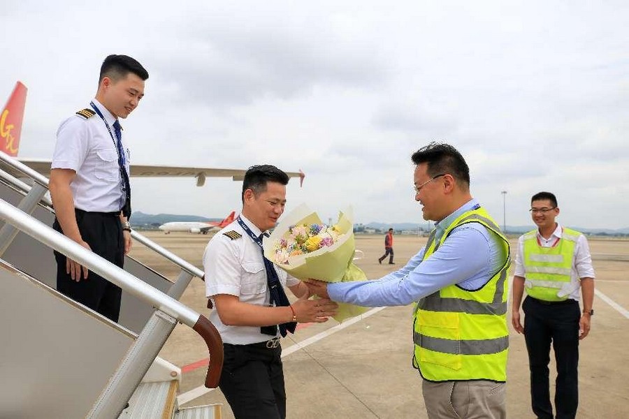北部灣航空總裁高育昆向機組人員送上鮮花