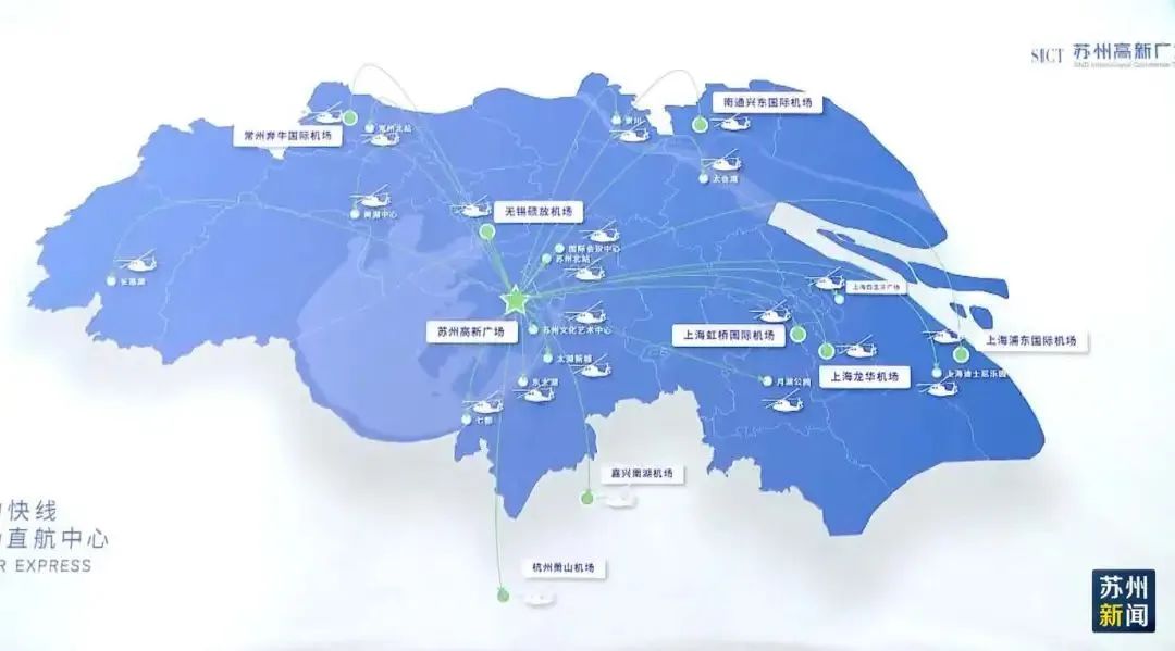 目前,苏州空中快线高新广场直航中心正式启用,已开通苏州至苏南硕放国际机场的航线(约12分钟)。未来苏州还将计划开通至上海虹桥机场、浦东机场的直升机联程接驳航线。