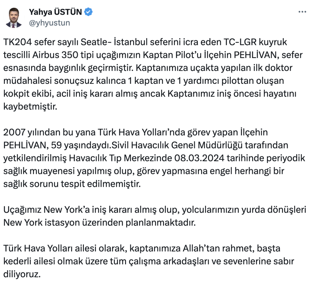 土耳其航空发言人在社交媒体上表示,涉事航班为TK204,由一架A350执飞。在该飞机从西雅图飞往伊斯坦布尔途中,?lçehin Pehlivan忽然昏迷,机组人员进行医疗干预但并未有效。随后副驾驶接管飞机,并决定紧急备降,但?lçehin Pehlivan在飞机降落前已失去生命体征。