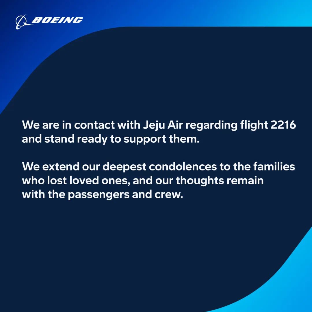 波音就7C2216航班事故发表声明:我们正在与济州航空就2216航班事宜保持联系,并随时向他们提供支援。我们对失去亲友的家庭表示最深切的哀悼,我们始终挂念乘客和机组人员。
