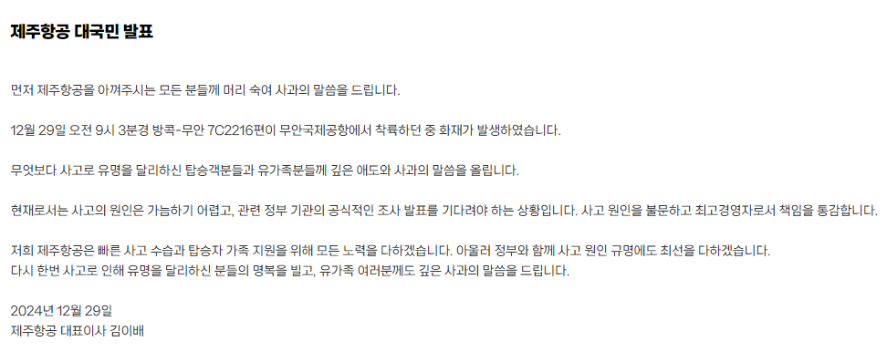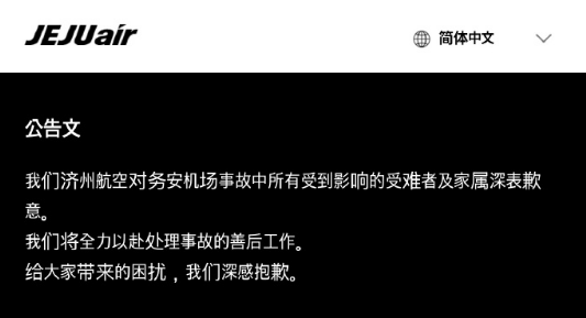 据央视新闻报道,12月29日,韩国济州航空代表理事金利培举行发布会,对当天客机碰撞起火事故中遇难者表示深切哀悼,“无论事故原因如何,都负有沉痛责任”。济州航空官网已置黑,官网首页公告显示:我们济州航空对务安机场事故中所有受到影响的受难者及家属深表歉意。我们将全力以赴处理事故的善后工作。给大家带来的困扰,我们深感抱歉。