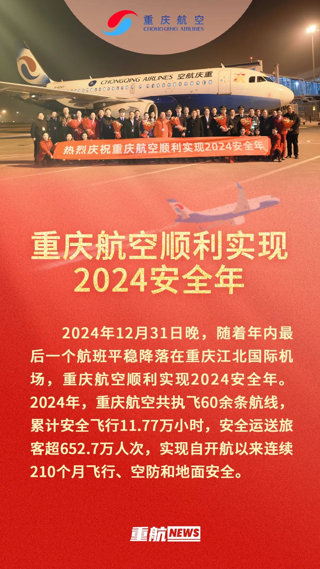 2024年12月31日晚,随着年内最后一个航班平稳降落在重庆江北国际机场,重庆航空顺利实现2024安全年。2024年,重庆航空共执飞60余条航线