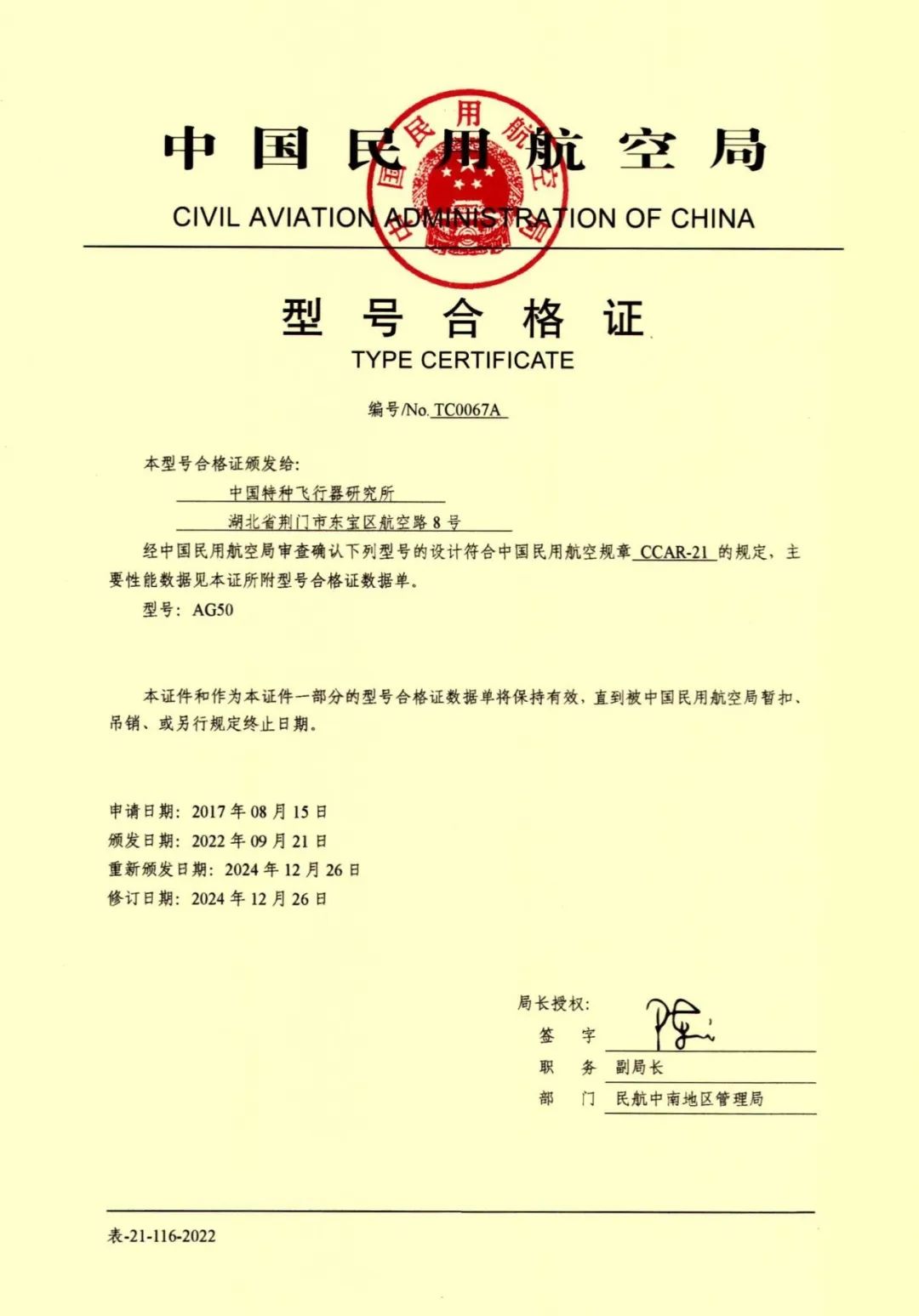 2024年12月30日,由中航工业特飞所自主研制的“领雁”AG50轻型运动飞机改进型成功获得由中国民航局颁发的型号合格证(编号:0067A)。