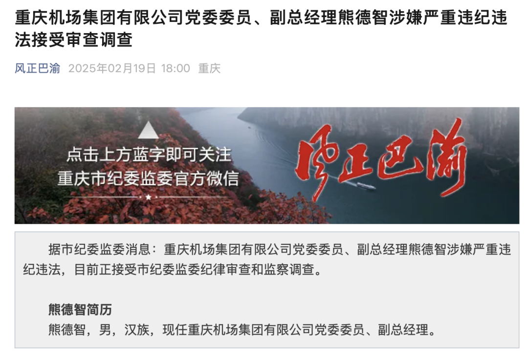 据重庆市纪委监委2月19日消息:重庆机场集团有限公司党委委员、副总经理熊德智涉嫌严重违纪违法,目前正接受重庆市纪委监委纪律审查和监察调查;