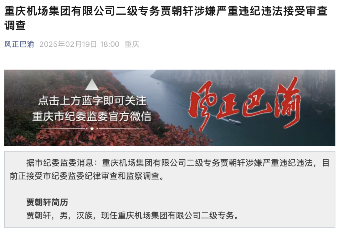 重庆机场集团有限公司二级专务贾朝轩涉嫌严重违纪违法,目前正接受重庆市纪委监委纪律审查和监察调查。
