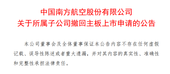 南航发布关于所属子公司撤回主板上市申请的公告,公告称公司自筹划本次分拆上市事项以来,积极推进相关事宜,组织中介机构开展尽职调查等相关工作,并严格按照相关法律法规和规范性文件的要求履行了决策程序和信息披露的义务。基于目前市场环境变化,为统筹安排资本运作规划,经充分沟通及审慎论证后,南航物流拟撤回上交所主板上市申请文件。