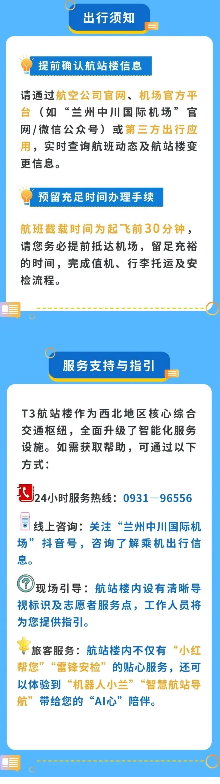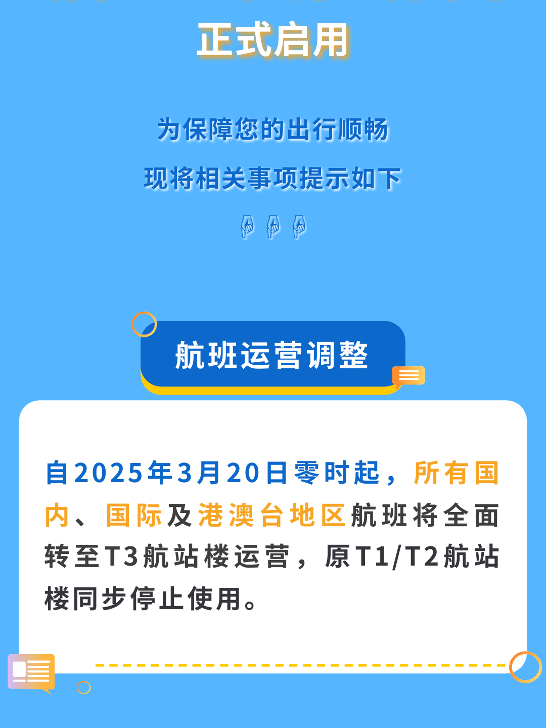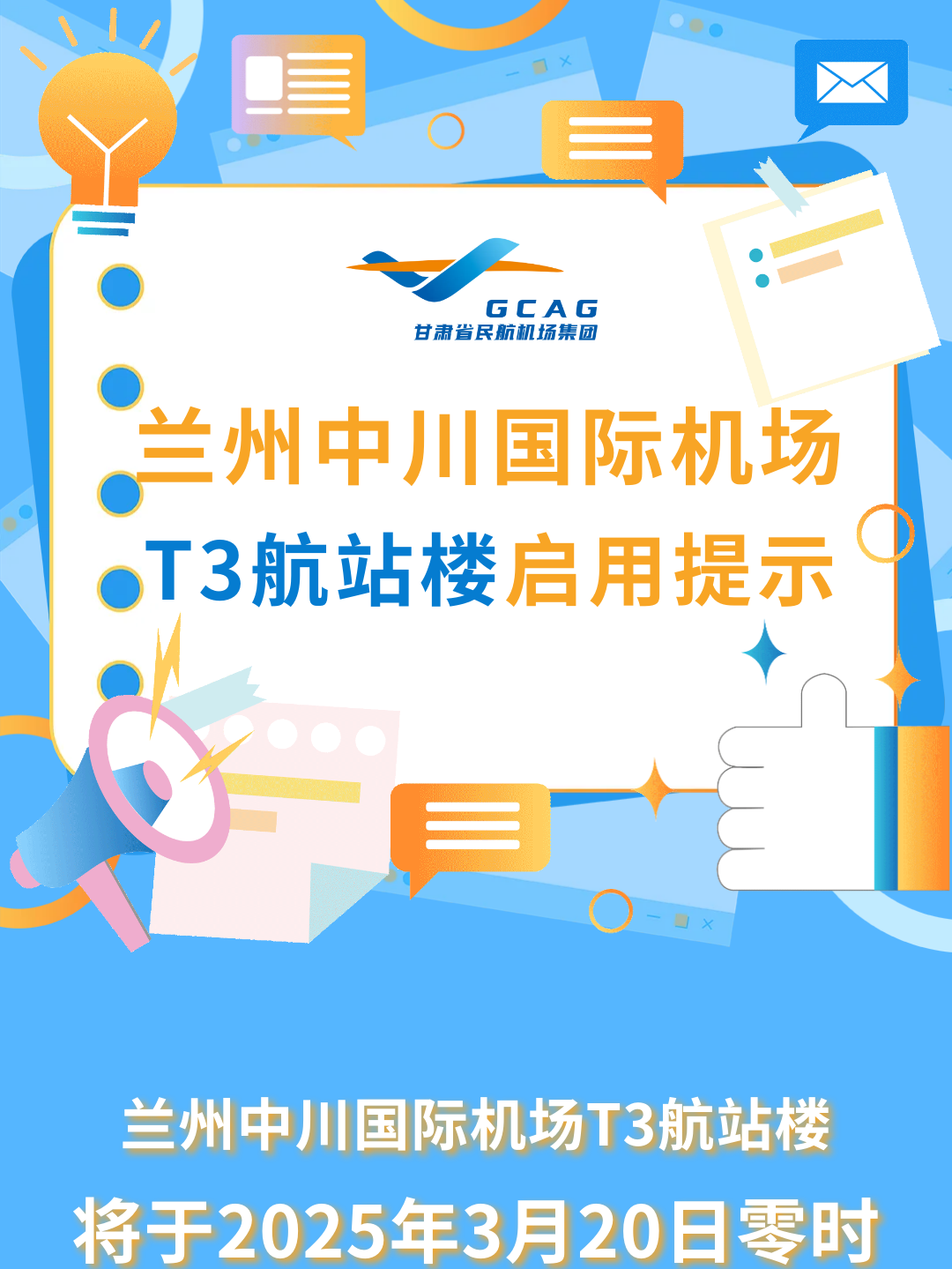 2025年3月4日,兰州中川国际机场发布公告,T3航站楼将于3月20日零时起正式启用。届时,所有国内、国际及港澳台地区航班将全面转至T3航站楼运营,原T1/T2航站楼同步停止使用。具体提示如下: