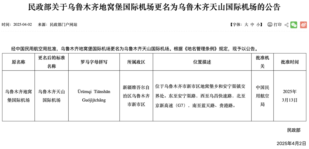 4月2日,民政部发布《民政部关于乌鲁木齐地窝堡国际机场更名为乌鲁木齐天山国际机场的公告》:经中国民用航空局批准,乌鲁木齐地窝堡国际机场更名为乌鲁木齐天山国际机场。根据《地名管理条例》规定,现予以公告。