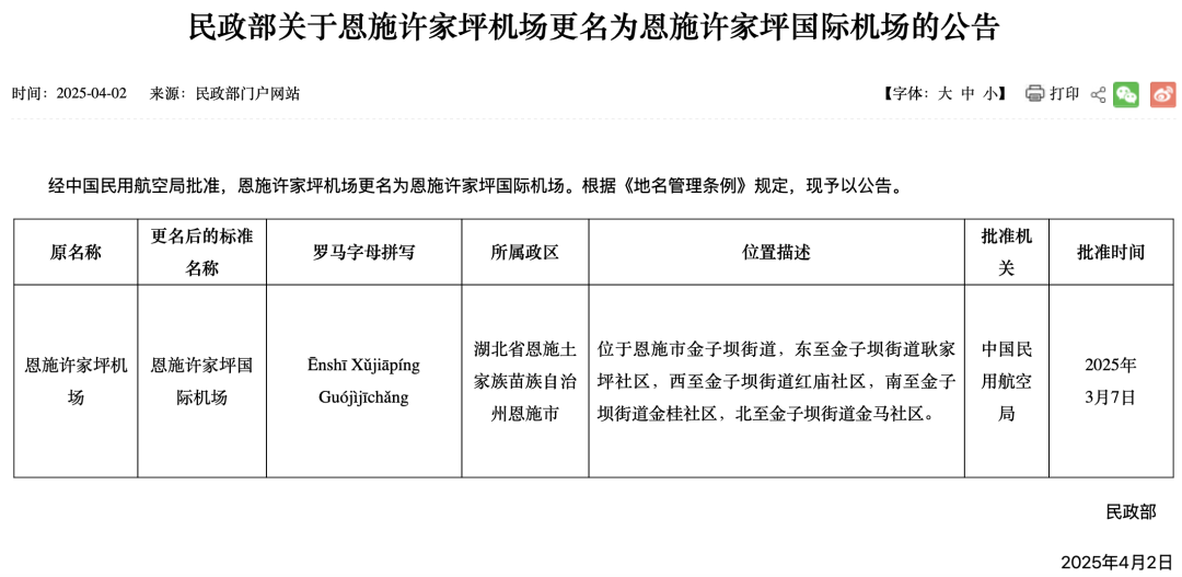 4月2日,民政部发布了关于恩施许家坪机场更名为恩施许家坪国际机场的公告:经中国民用航空局批准,恩施许家坪机场更名为恩施许家坪国际机场。根据《地名管理条例》规定,现予以公告。