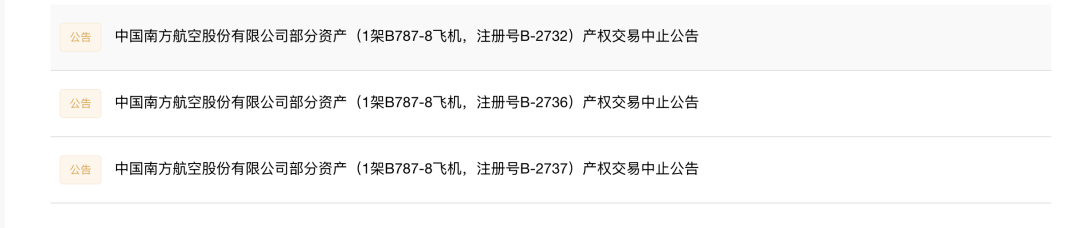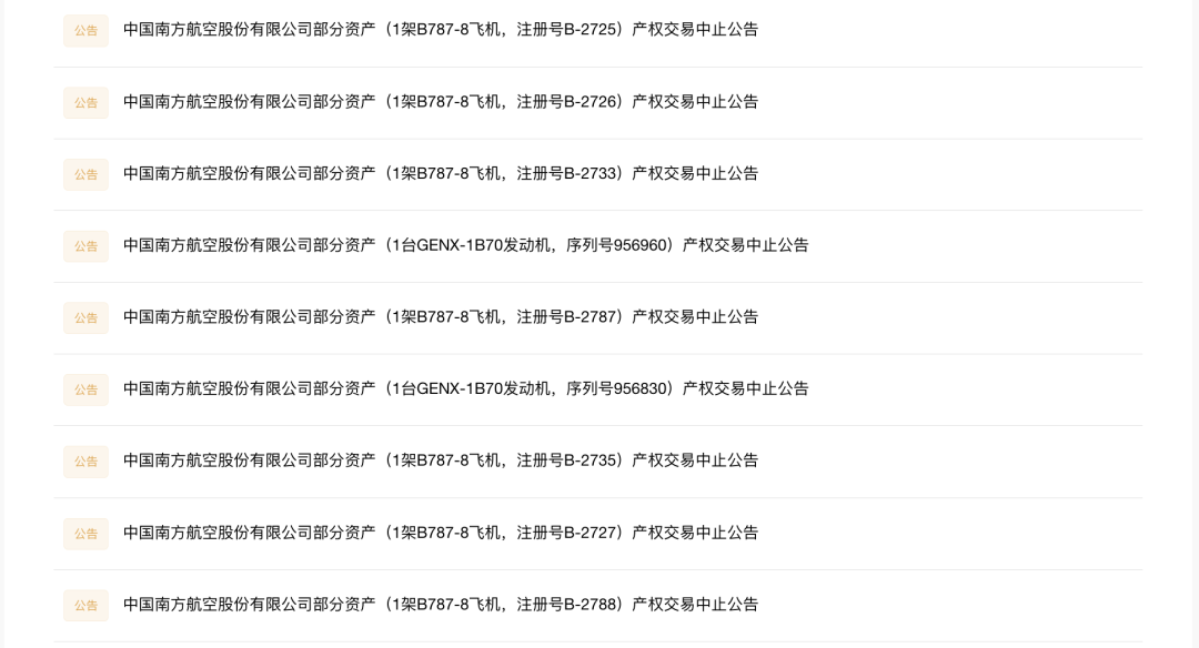 4月11日,南航在上海联合产权交易所发布了“中止旗下10架B787-8及2台GEnX发动机产权交易”的公告。