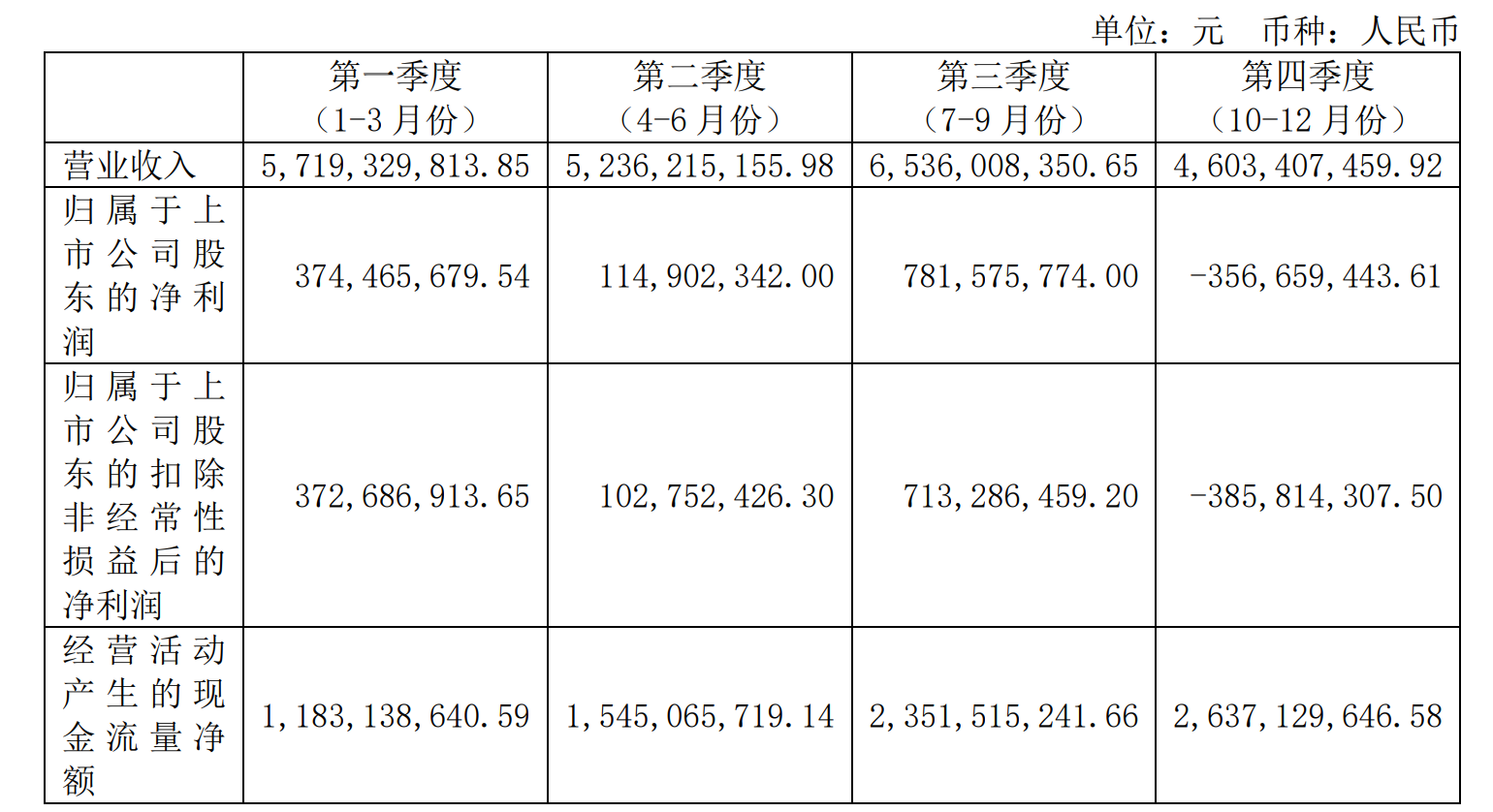 净利润分季度来看,一季度3.74亿元,二季度1.15亿元,三季度7.82亿元,第四季度亏损近3.57亿元。