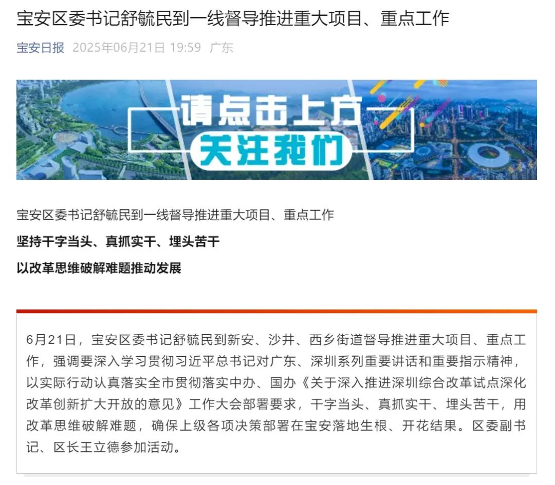 6月21日,《宝安日报》官方公众号报道,宝安区委书记舒毓民到一线督导推进重大项目、重点工作,提出坚持干字当头、真抓实干、埋头苦干,以改革思维破解难题推动发展。这则消息表明,舒毓民已任宝安区委书记。