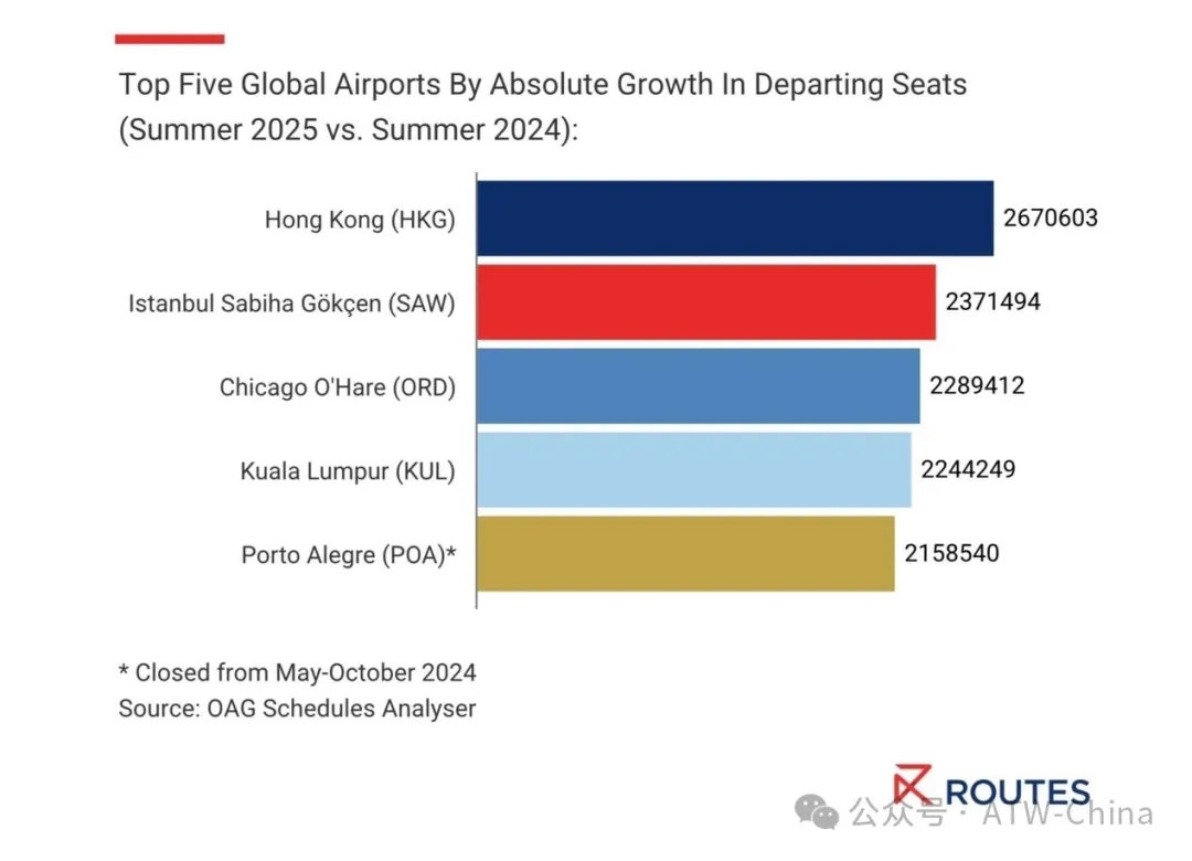 伊斯坦布尔萨比哈·格克琴国际机场以237万增量位居第二,芝加哥奥黑尔国际机场以229万增量紧随其后。吉隆坡国际机场排名第四,巴西阿雷格里港-萨尔加多·菲略国际机场(POA)因2024年夏季洪灾长期关闭后强势反弹,位列第五。