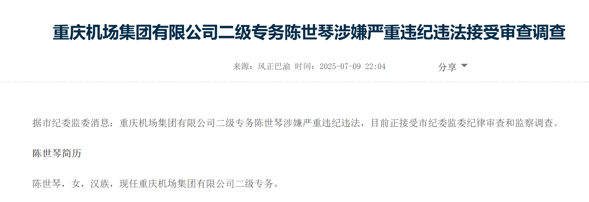 据重庆市纪委监委7月9日消息:重庆机场集团有限公司二级专务陈世琴涉嫌严重违纪违法,目前正接受市纪委监委纪律审查和监察调查。