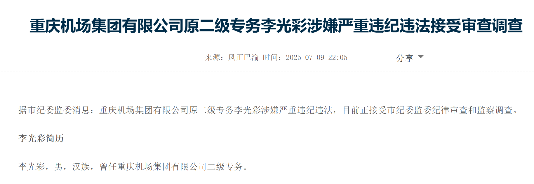 同日,重庆市纪委监委还发布消息,重庆机场集团有限公司原二级专务李光彩涉嫌严重违纪违法,目前正接受重庆市纪委监委纪律审查和监察调查。
