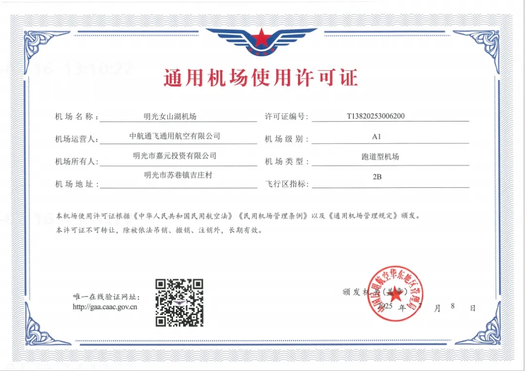 7月16日,由中国航空工业集团通飞所属通飞通航运营管理的明光女山湖机场顺利取得《通用机场使用许可证》,标志着机场已全面符合民航运行标准,将正式投入使用。