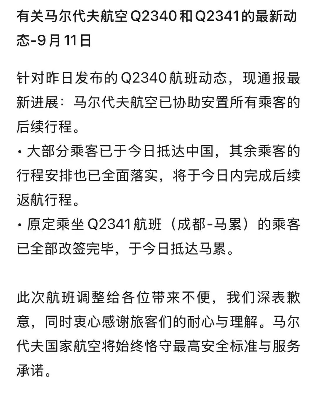 9月11日,马尔代夫航空发布有关马尔代夫航空Q2340和Q2341的最新动态,“大部分乘客已抵达中国,其余乘客的行程安排也已全面落实,将于当天完成后续返航行程。原定乘坐由成都飞往马累Q2341航班的乘客已全部改签并抵达马累”。