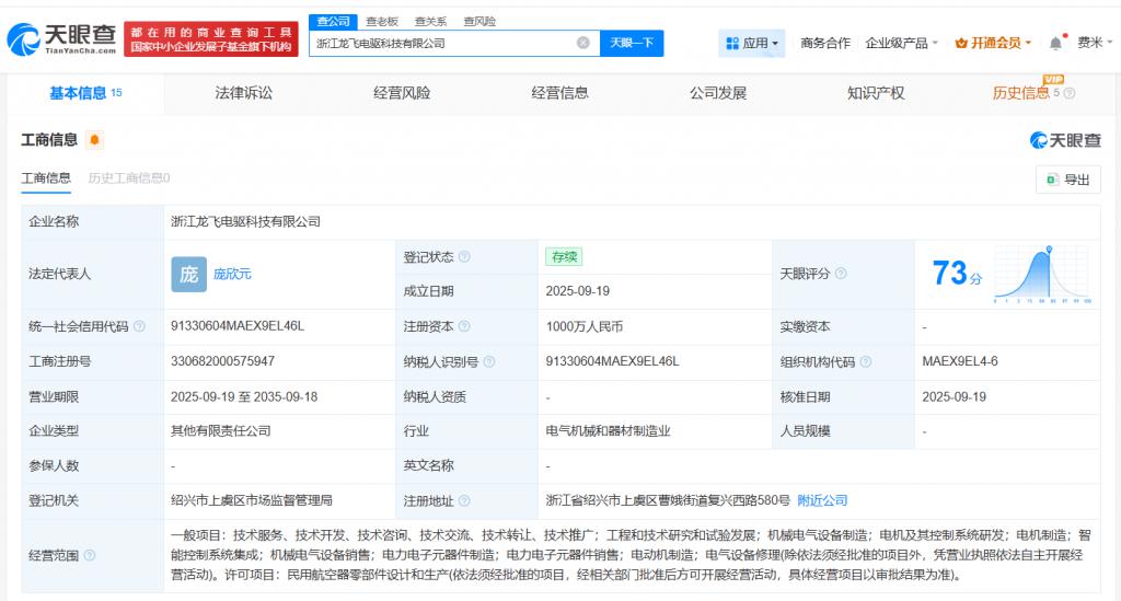 天眼查 App 显示,近日,浙江龙飞电驱科技有限公司成立,法定代表人为庞欣元,注册资本 1000 万人民币,经营范围包括工程和技术研究和试验发展、机械电气设备制造、电机及其控制系统研发等。股东信息显示,该公司由卧龙电驱(600580)、四川沃飞长空科技发展有限公司共同持股。