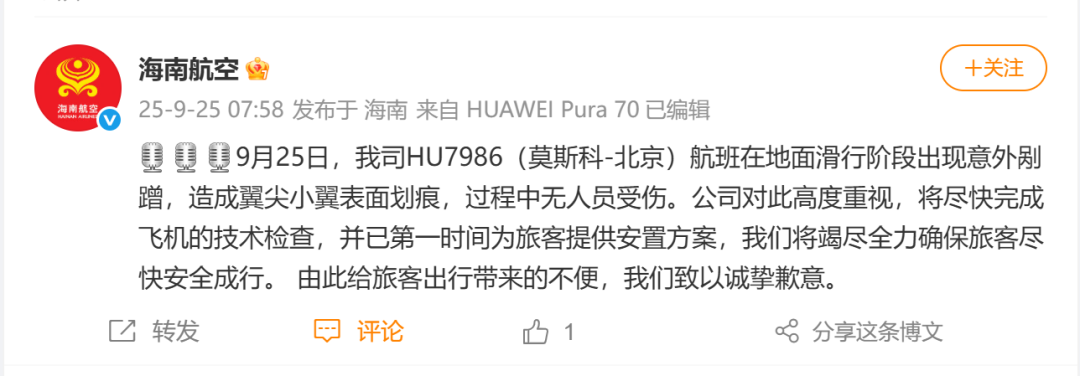 海南航空官微发布声明:9月25日,我司HU7986(莫斯科-北京)航班在地面滑行阶段出现意外剐蹭,造成翼尖小翼表面划痕,过程中无人员受伤。公司对此高度重视,将尽快完成飞机的技术检查,并已第一时间为旅客提供安置方案,我们将竭尽全力确保旅客尽快安全成行。 由此给旅客出行带来的不便,我们致以诚挚歉意。