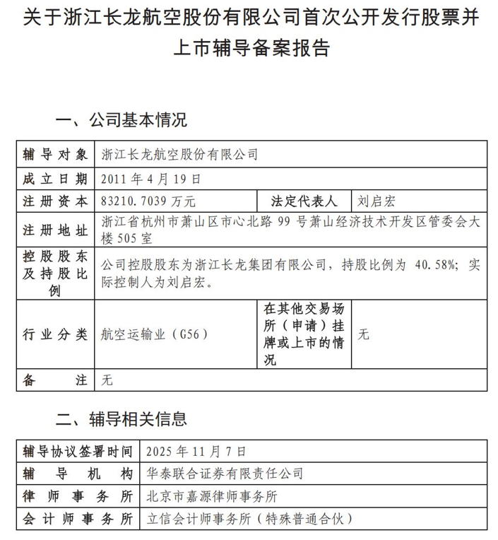 证监会网站披露,2025年11月17日浙江长龙航空股份有限公司在浙江证监局办理上市辅导备案登记,拟首次公开发行股票并上市,辅导券商为华泰联合证券。
