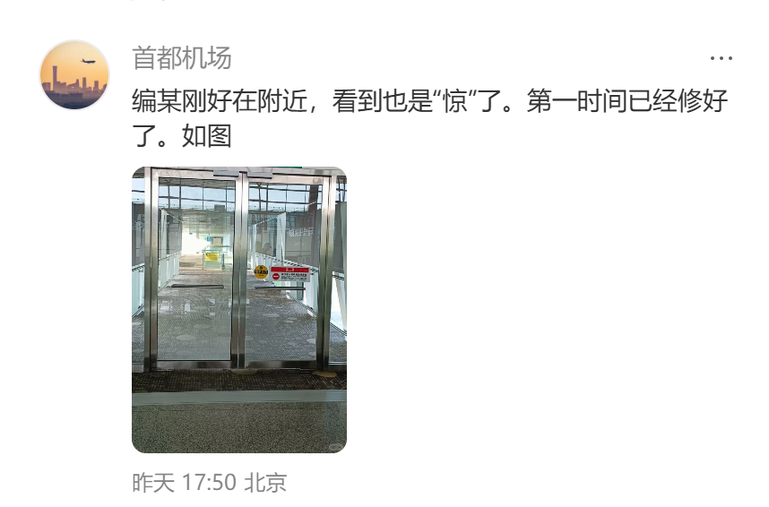 随后首都机场官方账号回应:第一时间已经修好了。