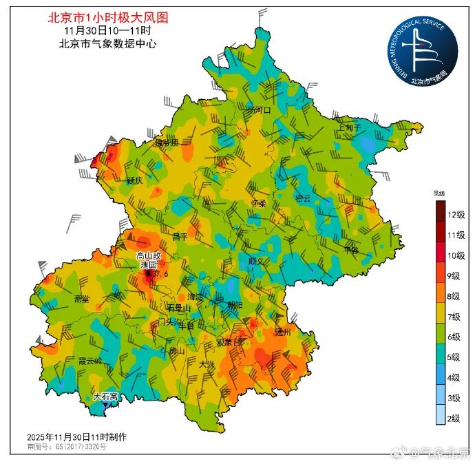 11月30日,北京市气象局官方微博发布大风蓝色预警信号,截至11时,全市阵风7级及以上有398个站(占比58.6%),9级及以上有46个站(占比6.8%)。