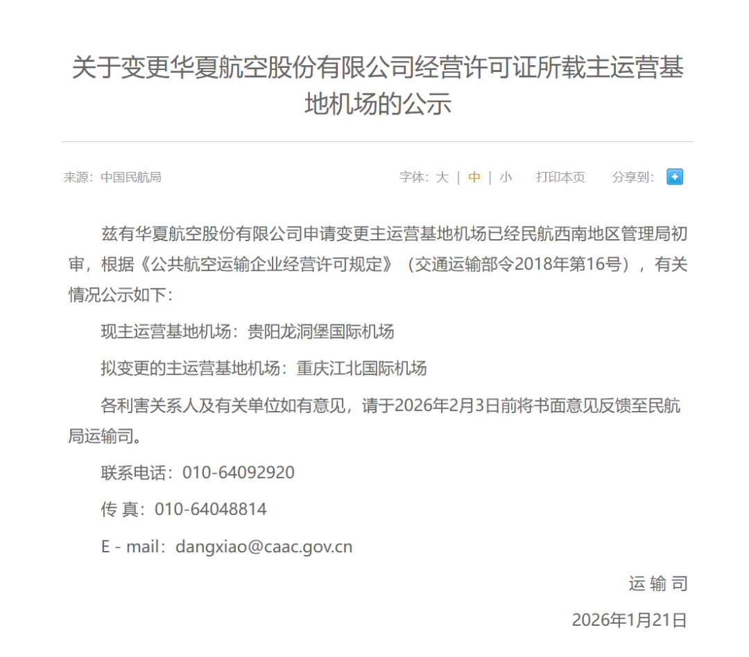 民航局官网发布关于变更华夏航空股份有限公司经营许可证所载主运营基地机场的公示,公示内容显示,华夏航空现主运营基地机场贵阳龙洞堡国际机场,拟变更的主运营基地机场为重庆江北国际机场。