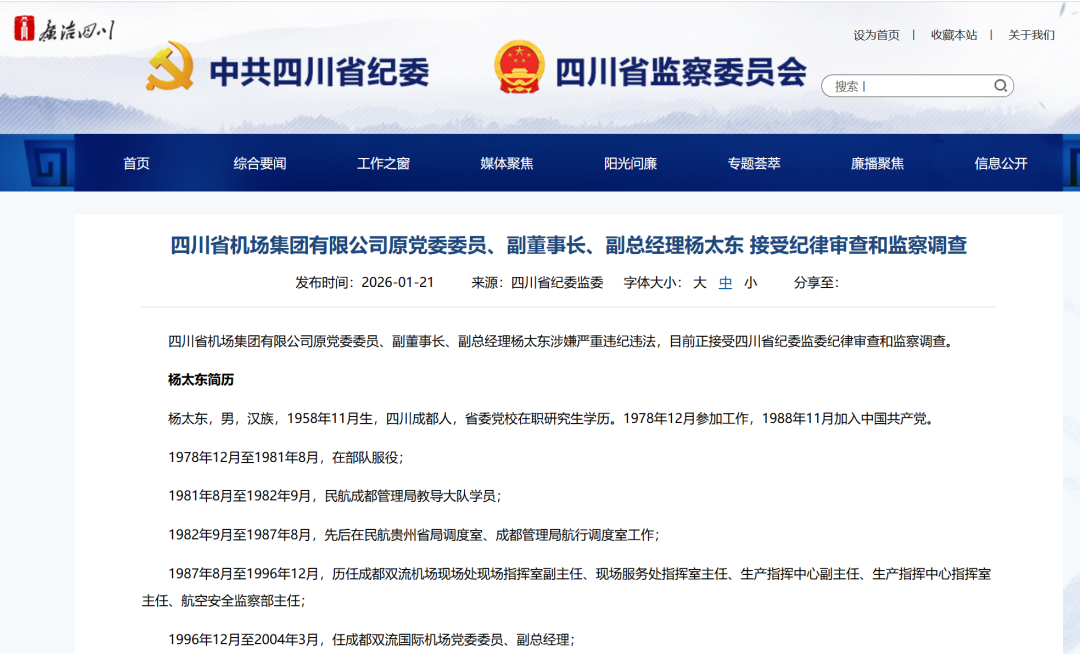 四川省纪委监委网站消息,四川省机场集团有限公司原党委委员、副董事长、副总经理杨太东涉嫌严重违纪违法,目前正接受四川省纪委监委纪律审查和监察调查。