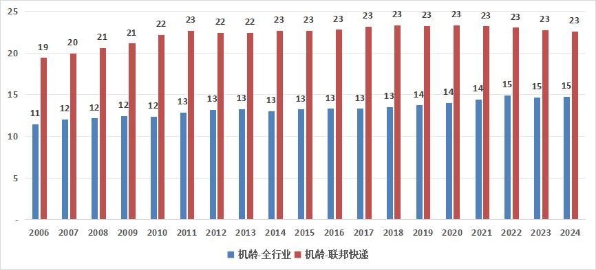 纵向看,至少自美国运输统计局有公布数据的2006年以来,联邦快递的平均机龄始终远高于全行业平均水平。