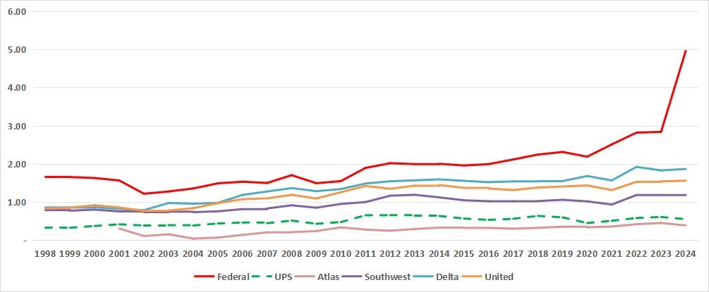 再换个指标看,2023年联邦快递国内平均航距705英里,对照联邦快递费率表,联邦快递在美国国内为一个150磅(约68公斤)包裹提供次日10:30送达服务的零售价格约1167美元,150磅相当于一名成年旅客重量,同年,西南航空、达美航空、联合航空的国内平均航距分别是723、941、1119英里,平均票价分别是151、300、309美元(按最大口径即营业收入),虽然都是美国国内市场,虽然运输重量相近,虽然运输距离相近或更长,三大客运航空公司的平均票价却分别只有联邦快递的13%、26%、26%,实在低的可怜。