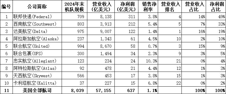 另外,1990-2024年美国合计净利润前十航空公司的第九名公司,天西航空(SkyWest)销售净利率3.8%,远高于同期全行业1.1%,但是,该公司长期只运营支线飞机,2024年末机队规模566架,全是可供业载只有24-38吨的CL-600或ERJ170-200等支线飞机。