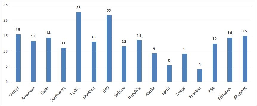 如前所述,联邦快递的机队整体飞机日利用率(轮挡小时)长期低于全行业,绝大部分年度只有全行业40%左右,其中,258架小型飞机Cessna 208的日利用率只有0.9小时,主力机型宽体机B767-300的日利用率2015年起也始终低于全行业。