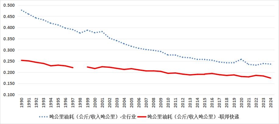 虽然联邦快递长期运营老旧飞机,2006年以来平均机龄始终远高于全行业平均水平,联邦快递1990年以来的吨公里油耗始终低于美国民航全行业平均水平。