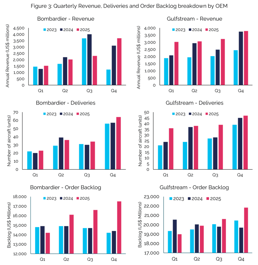 从 OEM 交付份额来看,德事隆与巴航工业各占约五分之一;庞巴迪与湾流紧随其后,占比在15%-19%之间;达索、皮拉图斯及其他小众制造商构成其余份额。