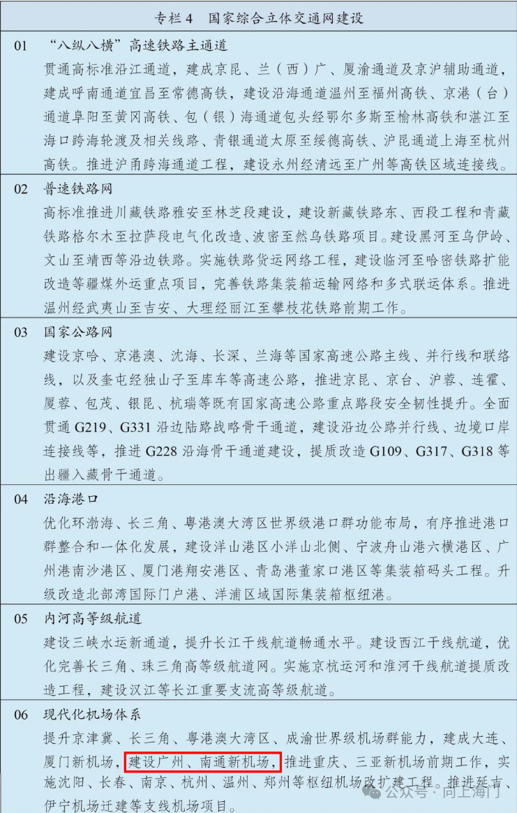 在“现代化机场体系”中明确指出,十五五期间,将建设广州、南通新机场。