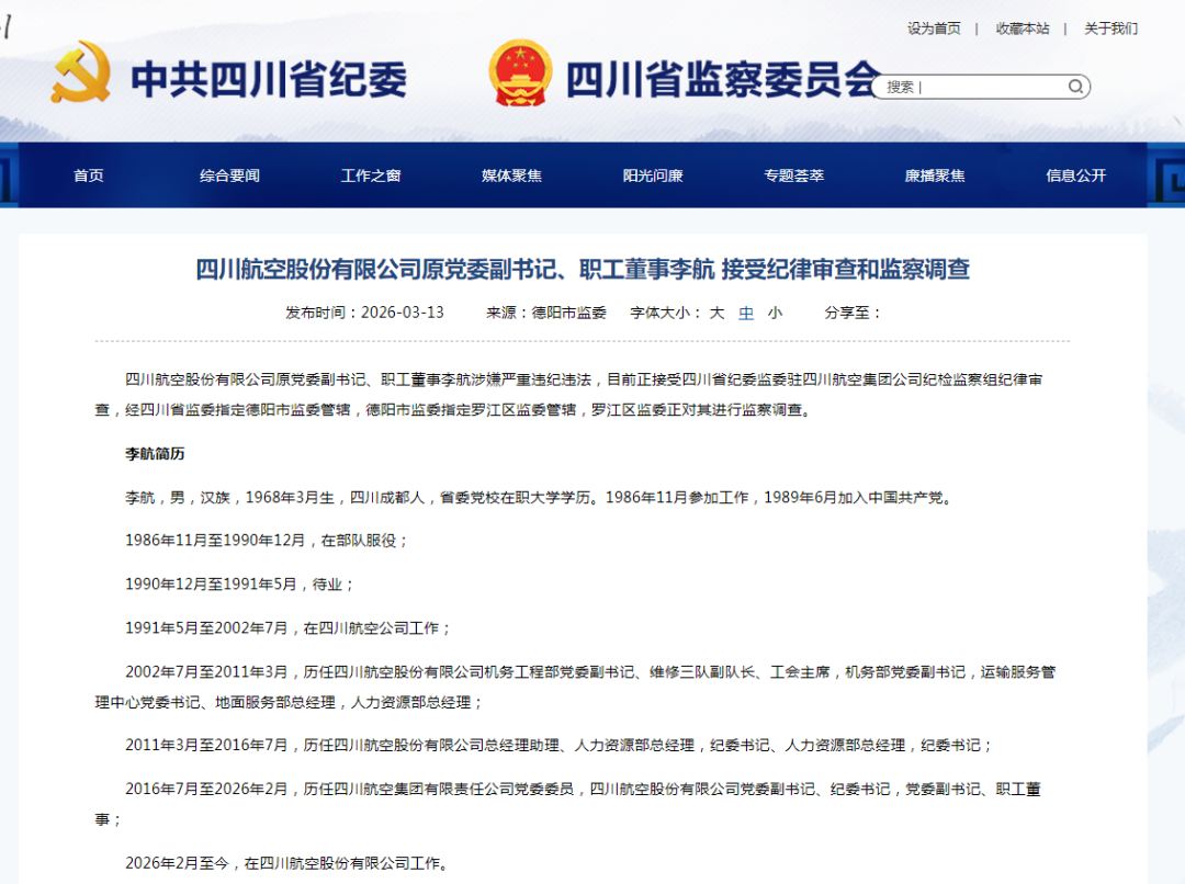 四川航空股份有限公司原党委副书记、职工董事李航涉嫌严重违纪违法,目前正接受四川省纪委监委驻四川航空集团公司纪检监察组纪律审查,经四川省监委指定德阳市监委管辖,德阳市监委指定罗江区监委管辖,罗江区监委正对其进行监察调查。