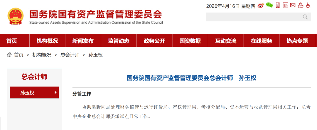 国资委网站显示,原中航集团总会计师、党组成员孙玉权,已任国务院国资委总会计师。