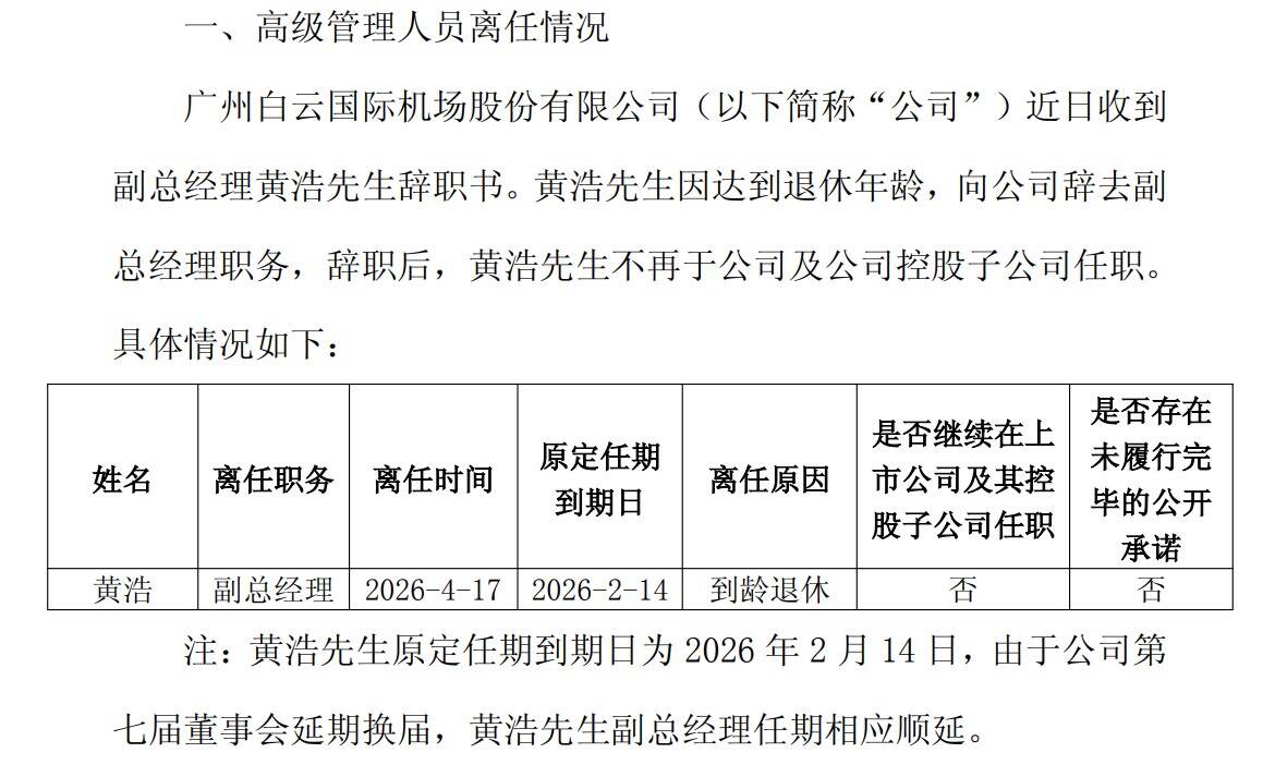 4月17日,白云机场发布公告称,公司近日收到副总经理黄浩先生辞职书。黄浩先生因达到退休年龄,向公司辞去副总经理职务,辞职后,黄浩先生不再于公司及公司控股子公司任职。上述辞职申请自送达公司董事会时生效。截至本公告披露日,黄浩先生未持有公司股份。