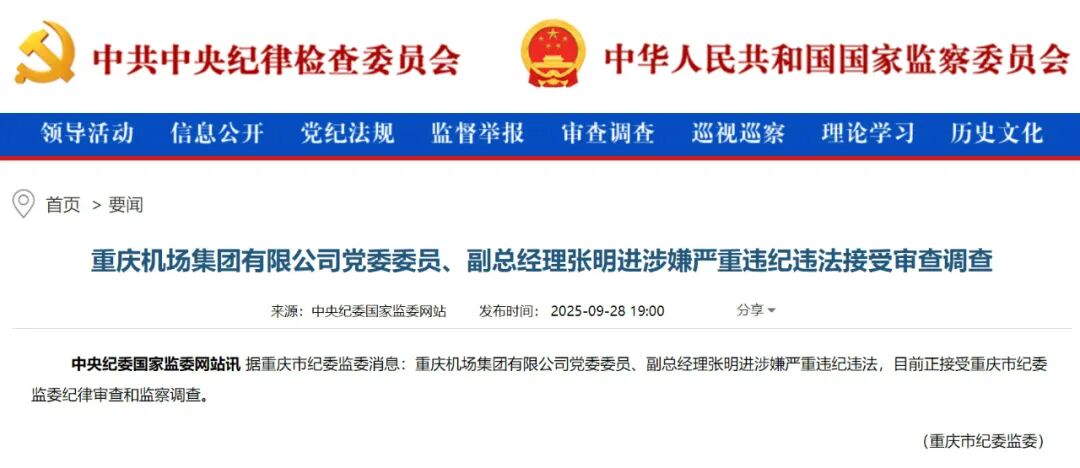 据重庆市纪委监委消息:重庆机场集团有限公司党委委员、副总经理张明进涉嫌严重违纪违法,目前正接受重庆市纪委监委纪律审查和监察调查。