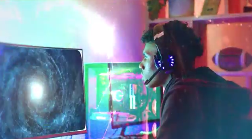 视频开头出现了Xbox One的标志,看起来像是一个游戏的开场,然后画面逐渐淡入一段蒙太奇,其中穿插着年轻人玩各种在线电脑游戏的画面,以及人们在空中交通管制塔台工作的画面。