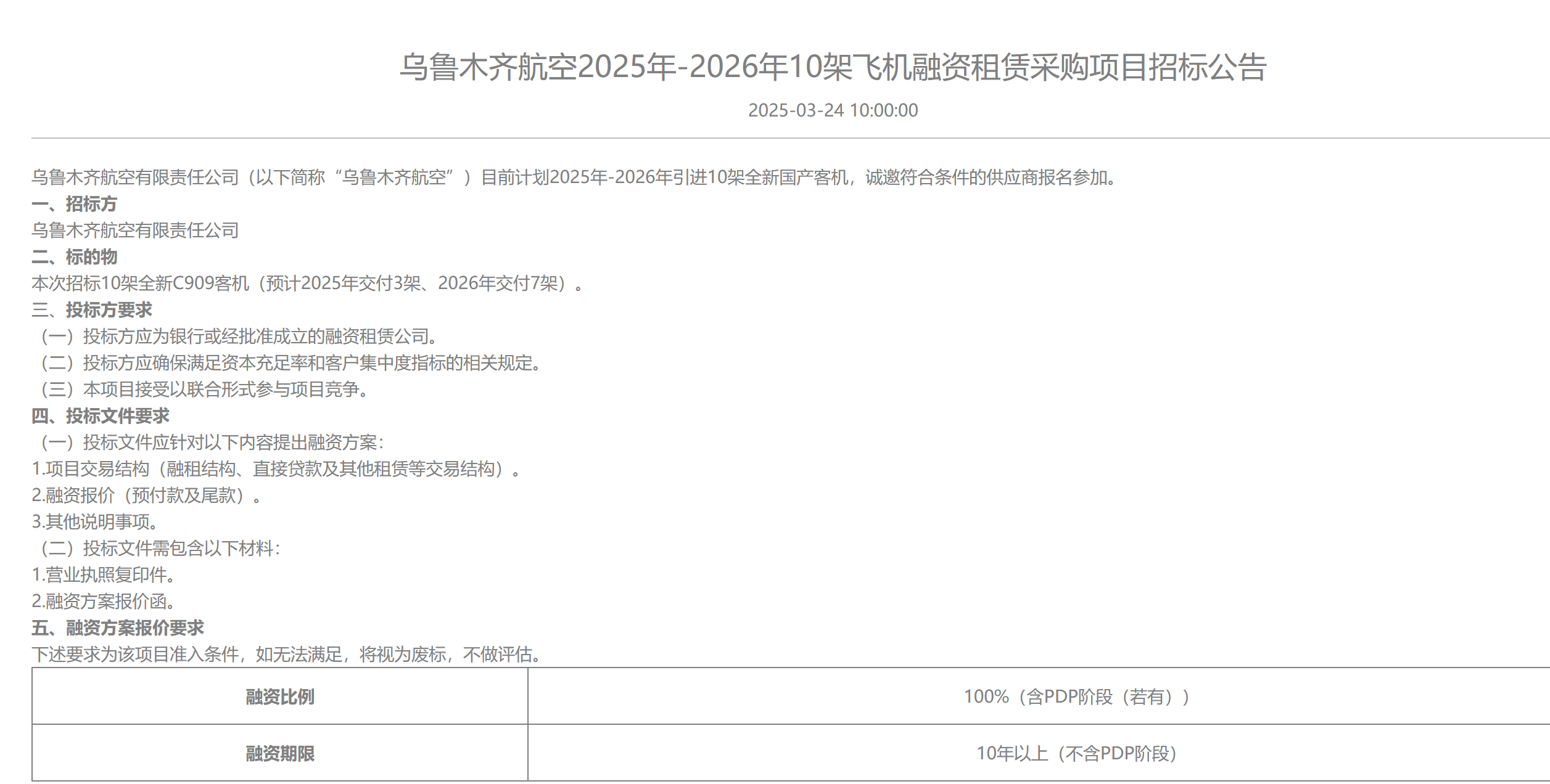 近日,乌鲁木齐航空发布《乌鲁木齐航空2025年-2026年10架飞机融资租赁采购项目招标公告》,《公告》表示,乌鲁木齐航空计划2025年-2026年引进10架全新C909国产客机,预计2025年交付3架、2026年交付7架。